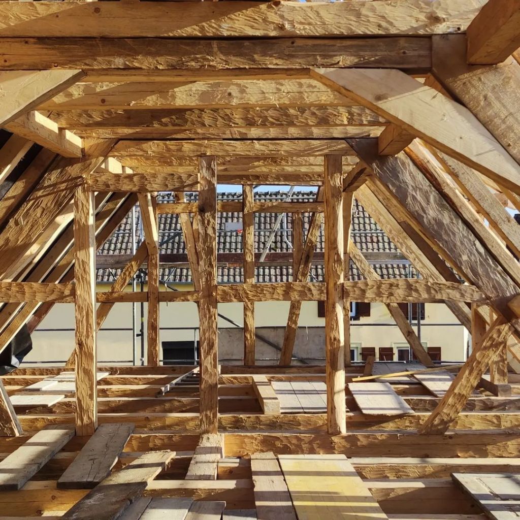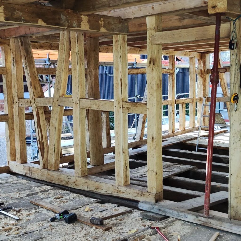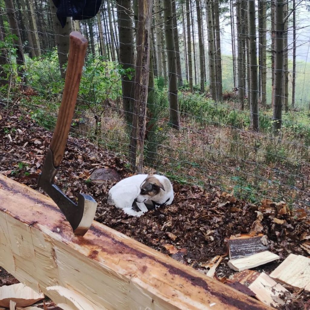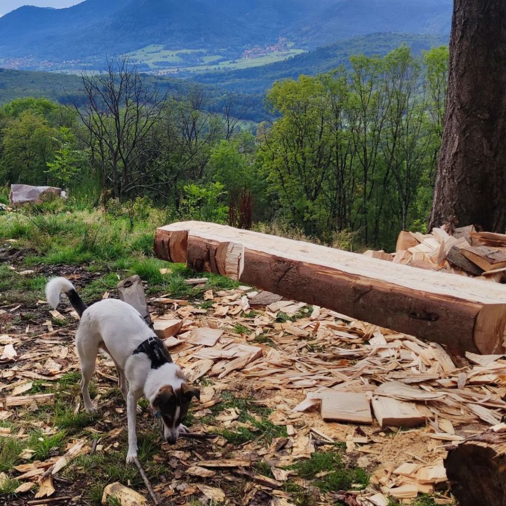 L’intégralité des poutres constituant le colombage de cette maison ont été façonnées à la main, à coups de hache. La passion qui nourrit notre entreprise pour le bois nous permet d’entreprendre des chantiers comme celui-ci, où chaque pièce de bois témoigne du savoir-faire traditionnel. Nous nous engageons à respecter les techniques artisanales tout en intégrant l’harmonie entre nature et architecture, ce qui nous permet de créer des structures à la fois esthétiques et durables. Chaque poutre, soigneusement sélectionnée et travaillée, contribue non seulement à la solidité de la construction, mais également à l’âme chaleureuse de cette maison.