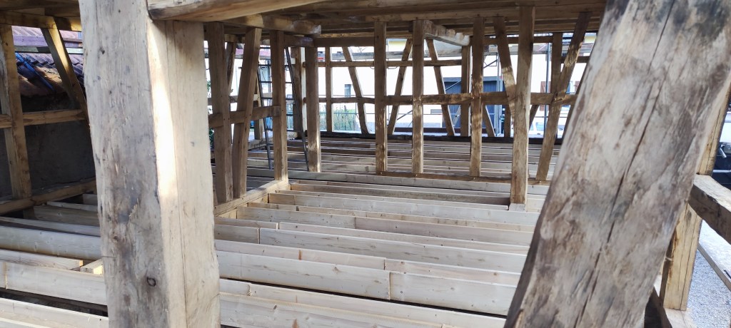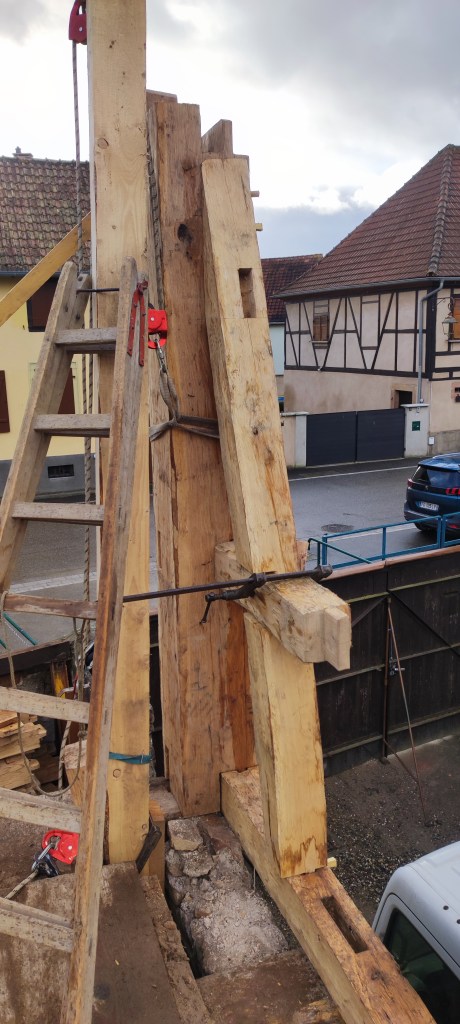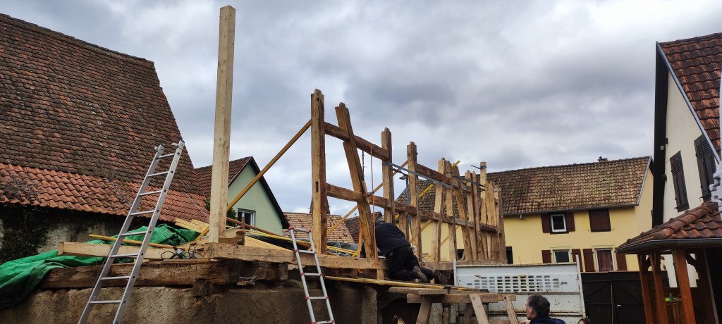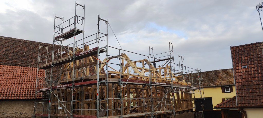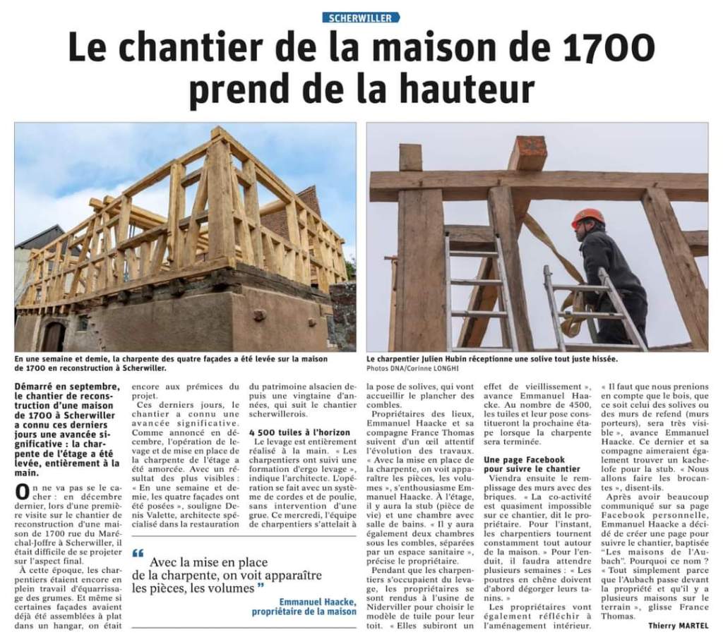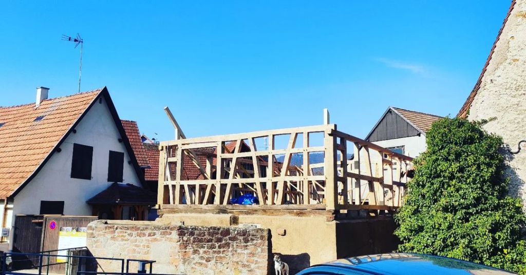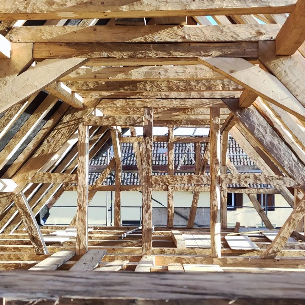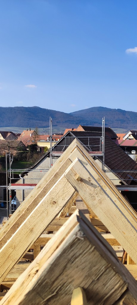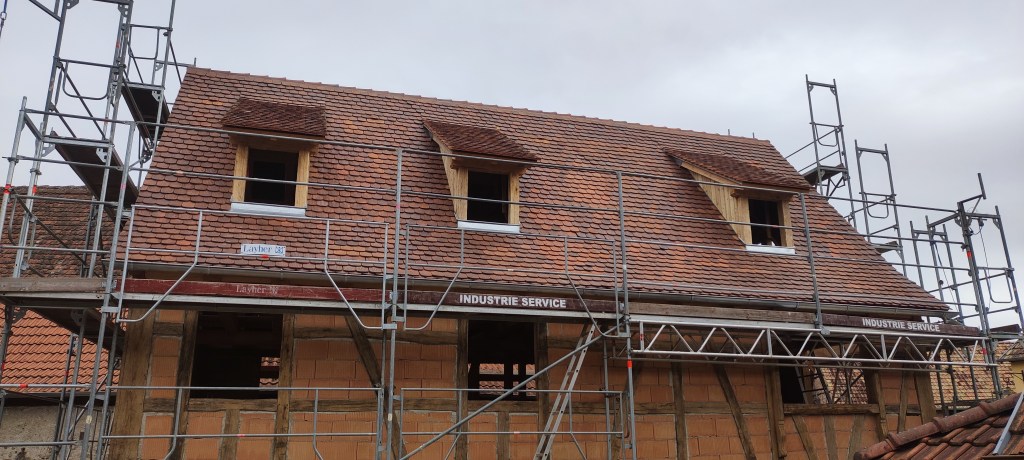 Le chantier durera 5 mois, couverture comprise. Cette dernière sera faite avec les tuiles de Niderviller, façonnées à la main avec l’argile local, ce qui leur confère un caractère unique et durable. Chaque tuile est le fruit d’un savoir-faire traditionnel, respectant des méthodes artisanales transmises de génération en génération. De plus, l’utilisation de matières premières locales permet de garantir une parfaite intégration dans le paysage environnant, tout en minimisant l’empreinte carbone liée au transport. Ainsi, non seulement la toiture offre une protection optimale, mais elle contribue également à l’esthétique globale de la construction, tout en s’inscrivant dans une démarche écoresponsable.